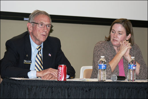 | Regent Steve Bosley and CU-Boulder law professor Melissa Hart, both running for the at-large seat on the Board of Regents, articulate their differences at Friday's debate sponsored by the School of Public Affairs at UC Denver. |