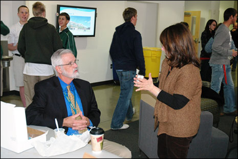 | John Freed, M.D., a professor and dean of the Graduate School at the Anschutz Medical Campus, talks with students and educators from high schools around the region at Tuesday's Colorado-Wyoming Junior Academy of Science. Freed coordinated the day of lectures by School of Medicine professors. |